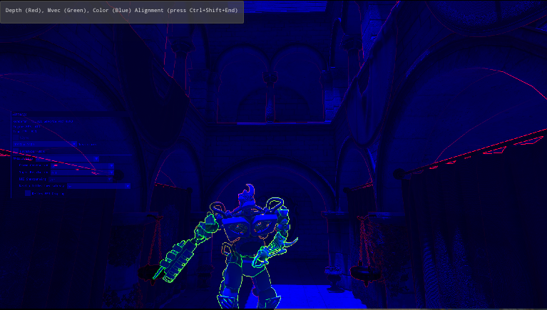 Alignment Visualizes the alignment of depth, motion vectors, and color buffers using a Sobel filter - Image should be mostly blue (color data)